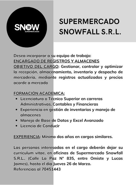 InicioRadio CambalacheRequerimiento de personal... Requerimiento de personal – Supermercado SNOWFALL S.R.L. Por Equipo de Edición 26 marzo, 2026 - 11:54 FacebookWhatsAppX Últimas Noticias ABC Cochabamba aclara: Tramo Río Caine – Toro Toro... Portada Justicia para la Cooperativa Unificada: Tres enviados a prisión tras violento ataque que dejó a un minero al borde de la muerte Portada Concejo Municipal de Potosí anuncia abrogación del interinato de Waldo Porcel y convoca a elección de nuevo Alcalde Sustituto Cuando Hablan Las Urnas AS logró un triunfo contundente en asambleístas por territorio; pero no le alcanza para los dos tercios Cuando Hablan Las Urnas Oficial: AS obtuvo la mitad de asambleístas por población Continua leyendo Radio CambalacheRestaurant Familiar “El Palacio de los Mariscos” Radio CambalacheGran Apertura de Pescaderia “Villa del Mar” Radio CambalacheConvocatoria a reunión general de exalumnos del Colegio Aniceto Arce