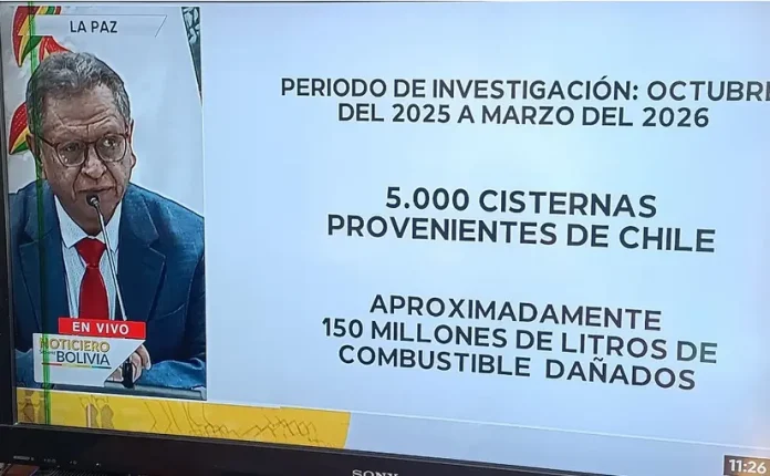 “Ya tenemos identificado el mecanismo, con pruebas fehacientes. Aproximadamente 5.000 cisternas provenientes de Chile ingresaron al país, lo que representa cerca de 150 millones de litros de combustible, pero también 150 millones de litros de agua sucia y aceite que fueron introducidos en las cisternas que llegaron a Bolivia”, remarcó la autoridad.