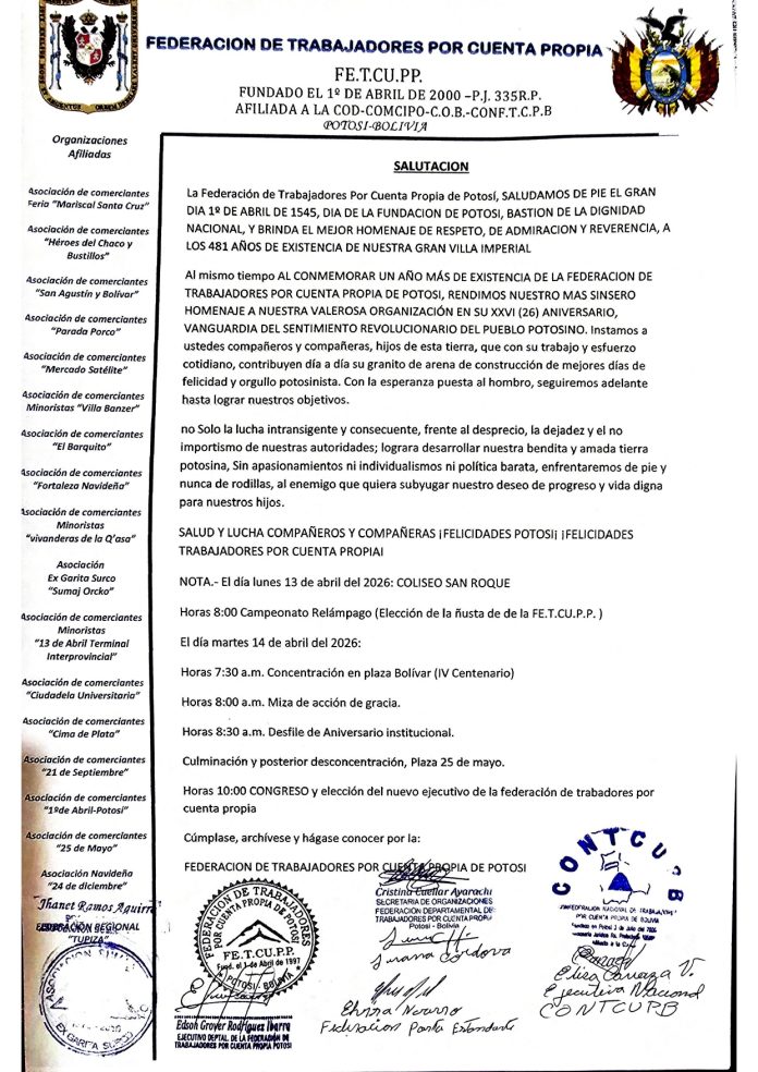 InicioRadio CambalacheSALUTACIÓN DE LA... SALUTACIÓN DE LA FEDERACION DE TRABAJADORES POR CUENTA PROPIA DE POTOSI Por Equipo de Edición 1 abril, 2026 - 11:16 FacebookWhatsAppX Últimas Noticias Una Bolivia batalladora y que mereció más, cae con... Portada Aeropuerto de Potosí proyecta operar aeronaves de mayor capacidad tras pruebas de vuelo Portada Ministerio Público y FEDECOMIN articulan acciones para frenar el robo de minerales en Potosí Portada CODEPEDIS insta a personas con discapacidad a cobrar el bono “PEPE” antes de fin de mes Portada FEDECOMIN exige acción conjunta contra los “jukus” para frenar el robo de minerales en Potosí Continua leyendo Radio CambalacheCentro de Diagnóstico por Imagen CEDIIM, 6 años comprometidos con la salud Radio CambalacheSÉPTIMO AVISO DE REMATE Radio Cambalache¿Buscas un vestido que deje a todos maravillados al verte?
