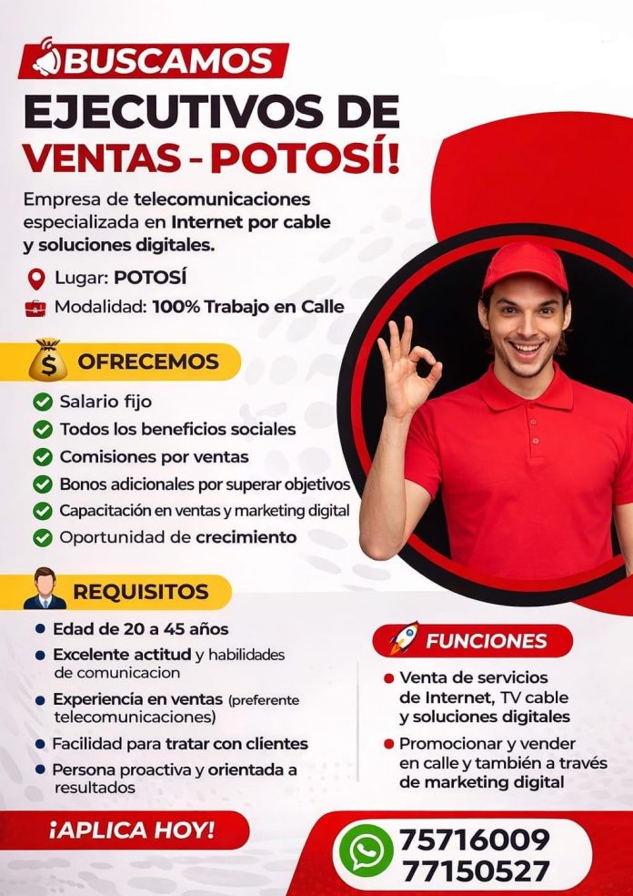 InicioRadio CambalacheREQUERIMIENTO DE PERSONAL:... REQUERIMIENTO DE PERSONAL: EJECUTIVO DE VENTAS PARA POTOSÍ Por Equipo de Edición 2 abril, 2026 - 12:20 FacebookWhatsAppX Últimas Noticias El Pulso del día: ¿Cuál es la noche más... Portada Brigada parlamentaria llama a unidad para aprobar leyes minera y del litio en Potosí Portada Casos de violencia familiar en ascenso preocupan a trabajo social en Potosí Portada Concejal electo llama a la unidad por el desarrollo de Potosí en su aniversario Portada Salud municipal retoma contrataciones tras retrasos administrativos Continua leyendo Radio CambalacheMENSAJE DE SALUTACION AL NACIMIENTO DE LA CIUDAD DE POTOSI Radio CambalacheSalutación – Unidad Educativa Técnico Humanístico “1° de Abril” Radio CambalacheNuevamente en Potosí, el Gran Tratamiento de Apiterapia