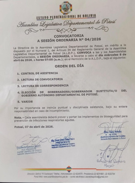 La Asamblea Legislativa Departamental de Potosí (ALDP) convocó a una sesión ordinaria para este miércoles 8 de abril, con el objetivo de elegir a una nueva autoridad que asuma como Gobernador(a) Sustituto(a) del departamento.