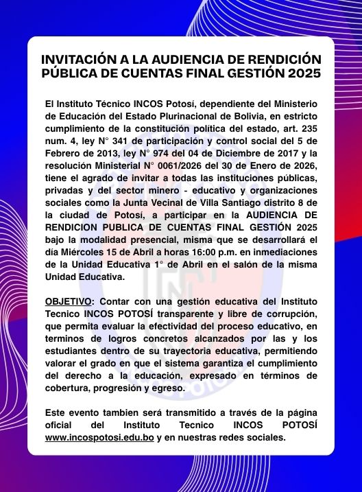 InicioRadio CambalacheInvitación a la... Invitación a la Audiencia de Rendición Pública de Cuentas Final Gestión 2025 Por Equipo de Edición 8 abril, 2026 - 11:31 FacebookWhatsAppX Últimas Noticias Confuso hecho con arma de fuego deja un fallecido... ¿Sabía usted? Del mito de la media naranja a la compleja convivencia: por qué el amor no tiene una fórmula universal Internacional El precio del petróleo se desploma tras el acuerdo para un alto el fuego de dos semanas en Irán Portada Vagoneta sufre vuelco tras chocar contra objeto fijo en la carretera Potosí–Uyuni Portada Intendencia interviene presunto prostíbulo clandestino en el centro de Potosí Continua leyendo Radio CambalacheFútbol… Fútbol… Pasión de multitudes Radio CambalacheREQUERIMIENTO DE PERSONAL: AGENTES INMOBILIARIOS Radio CambalacheSalutación por el Aniversario del Colegio Nacional Mariscal Otto Felipe Braun