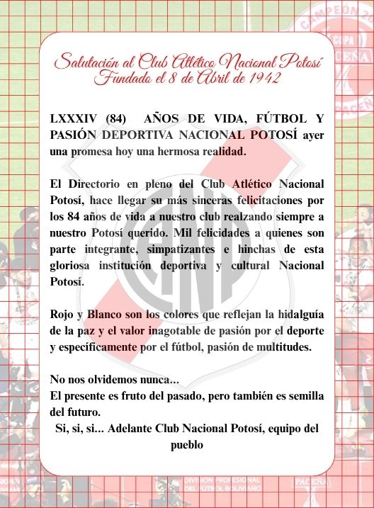 InicioRadio CambalacheSalutación al Club... Salutación al Club Atlético Nacional Potosí, fundado el 8 de abril de 1942 Por Equipo de Edición 8 abril, 2026 - 11:35 FacebookWhatsAppX Últimas Noticias Reeligen a gobernador sustituto en la Asamblea Legislativa Departamental... Portada Confuso hecho con arma de fuego deja un fallecido y una mujer herida en Sacaba ¿Sabía usted? Del mito de la media naranja a la compleja convivencia: por qué el amor no tiene una fórmula universal Internacional El precio del petróleo se desploma tras el acuerdo para un alto el fuego de dos semanas en Irán Portada Vagoneta sufre vuelco tras chocar contra objeto fijo en la carretera Potosí–Uyuni Continua leyendo Radio CambalacheSalutación Carrera de Sistemas Informáticos, ayer, hoy y siempre Radio CambalacheConvocatoria Pública – FEDECOMIN Potosí R.L. Radio CambalacheFútbol… Fútbol… Pasión de multitudes