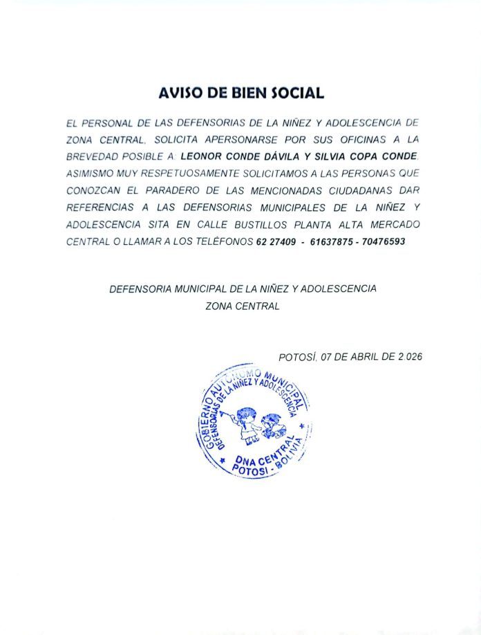 InicioRadio CambalacheAviso de Bien... Aviso de Bien social Por Equipo de Edición 9 abril, 2026 - 11:19 FacebookWhatsAppX Últimas Noticias Así es el perro robot que ‘habla’ y guía... ¿Sabía usted? Dolor de espalda al despertar: las 4 causas más comunes y cómo solucionarlas Portada Fallo agroambiental confirma contaminación con cianuro en lagunas de Potosí y da la razón a la Demanda de la Concejal Portada Comcipo denuncia nuevos hundimientos en el Cerro Rico y apunta a negligencia de autoridades Portada Analista aclara alcances del Decreto Supremo 5600 sobre compras directas en el Estado Continua leyendo Radio CambalacheCampaña Gratuita de Cirugías… Radio Cambalache¿Busca dónde imprimir o copiar sus planos y documentos? Radio CambalacheRequerimiento de personal