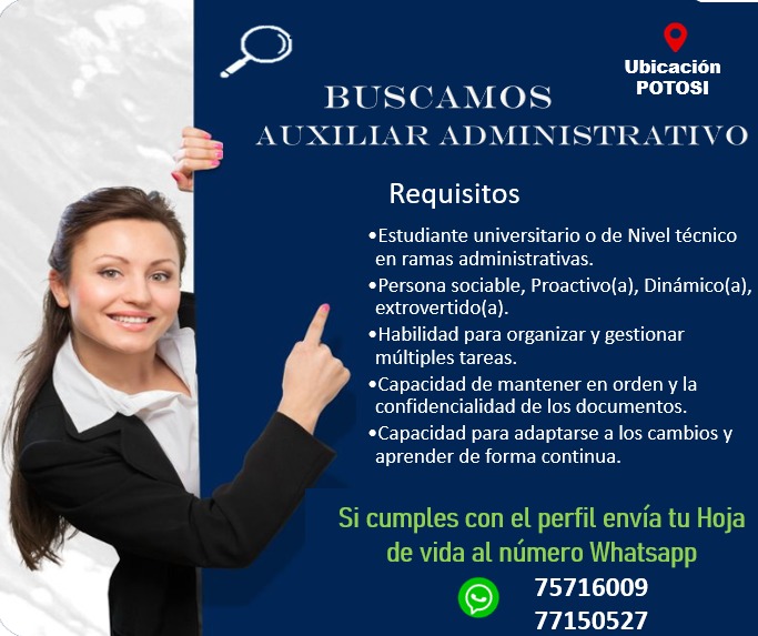 InicioRadio CambalacheREQUERIMIENTO DE PERSONAL:... REQUERIMIENTO DE PERSONAL: AUXILIAR ADMINISTRATIVO Por Equipo de Edición 9 abril, 2026 - 13:53 FacebookWhatsAppX Últimas Noticias Medinaceli, en la interpelación: “Yo nunca he participado en... Nacional El dólar referencial del BCB se cotiza este jueves en Bs 9,61 para la venta, el valor más alto desde su vigencia ¿Sabía usted? Así es el perro robot que ‘habla’ y guía a las personas con discapacidad visual ¿Sabía usted? Dolor de espalda al despertar: las 4 causas más comunes y cómo solucionarlas Portada Fallo agroambiental confirma contaminación con cianuro en lagunas de Potosí y da la razón a la Demanda de la Concejal Continua leyendo Radio CambalacheREQUERIMIENTO DE PERSONAL: ENCARGADO DE ALMACEN Radio CambalacheREQUERIMIENTO DE PERSONAL: AYUDANTE DE COCINA Radio CambalacheCampaña Gratuita de Cirugías…