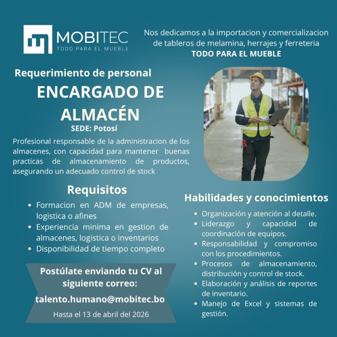 InicioRadio CambalacheREQUERIMIENTO DE PERSONAL:... REQUERIMIENTO DE PERSONAL: ENCARGADO DE ALMACEN Por Equipo de Edición 9 abril, 2026 - 13:53 FacebookWhatsAppX Últimas Noticias El dólar referencial del BCB se cotiza este jueves... ¿Sabía usted? Así es el perro robot que ‘habla’ y guía a las personas con discapacidad visual ¿Sabía usted? Dolor de espalda al despertar: las 4 causas más comunes y cómo solucionarlas Portada Fallo agroambiental confirma contaminación con cianuro en lagunas de Potosí y da la razón a la Demanda de la Concejal Portada Comcipo denuncia nuevos hundimientos en el Cerro Rico y apunta a negligencia de autoridades Continua leyendo Radio CambalacheREQUERIMIENTO DE PERSONAL: AUXILIAR ADMINISTRATIVO Radio CambalacheREQUERIMIENTO DE PERSONAL: AYUDANTE DE COCINA Radio CambalacheCampaña Gratuita de Cirugías…