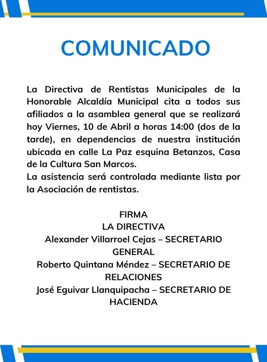 InicioRadio CambalacheComunicado - Rentistas... Comunicado – Rentistas Municipales de la Honorable Alcaldía Municipal Por Equipo de Edición 10 abril, 2026 - 11:14 FacebookWhatsAppX Últimas Noticias Horóscopos de Mhoni Vidente para el fin de semana:... Portada El Pulso del día: Contra viento y marea viva el ” DIA DEL NIÑO” Nacional El oficialismo evita la censura de Medinaceli frente a la dispersión de la opositora Libre y de su socia Unidad Portada Campaña canina de invierno llama a proteger a mascotas del frío en Potosí Portada Alcaldía anuncia actividades gratuitas por el Día del Niño Continua leyendo Radio CambalacheInvitación Pública – Primera Convocatoria Radio CambalacheSalutación al XV Aniversario de la Asociación de Hijos de Excombatientes y Beneméritos de la Guerra del Chaco de Potosí Radio CambalacheComunicado – Asociación de Jubilados Cooperativistas del Sistema Integral de Pensiones