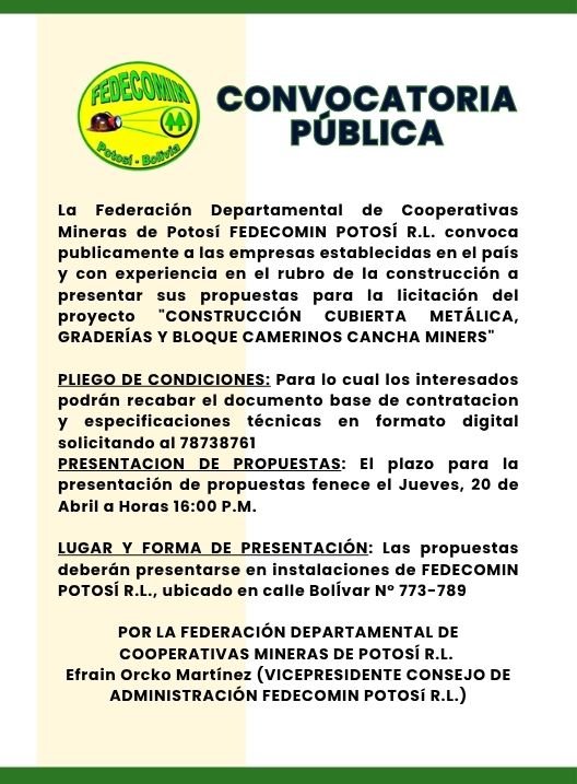 InicioRadio CambalacheConvocatoria Pública -... Convocatoria Pública – FEDECOMIN Potosí R.L. Por Equipo de Edición 15 abril, 2026 - 11:52 FacebookWhatsAppX Últimas Noticias Denuncia que concejales y dirigentes vecinales estarian involucrados en... Portada Intervendrán la administración del Cementerio General por venta ilegal de predios Portada Víctimas de violencia deben gastar unos Bs. 5.000 para que atiendan sus denuncias Portada Puna: 20 comunidades quedaron afectadas tras caída de granizada Portada Defensa Pública: Tres abogados atienden más de 1.800 casos Continua leyendo Radio CambalacheMia Bella Beauty Studio, Gran Reapertura este jueves 16 de abril Radio CambalacheInvitación Pública – Primera Convocatoria Radio CambalacheInvitación – Aguas termales de Rosario