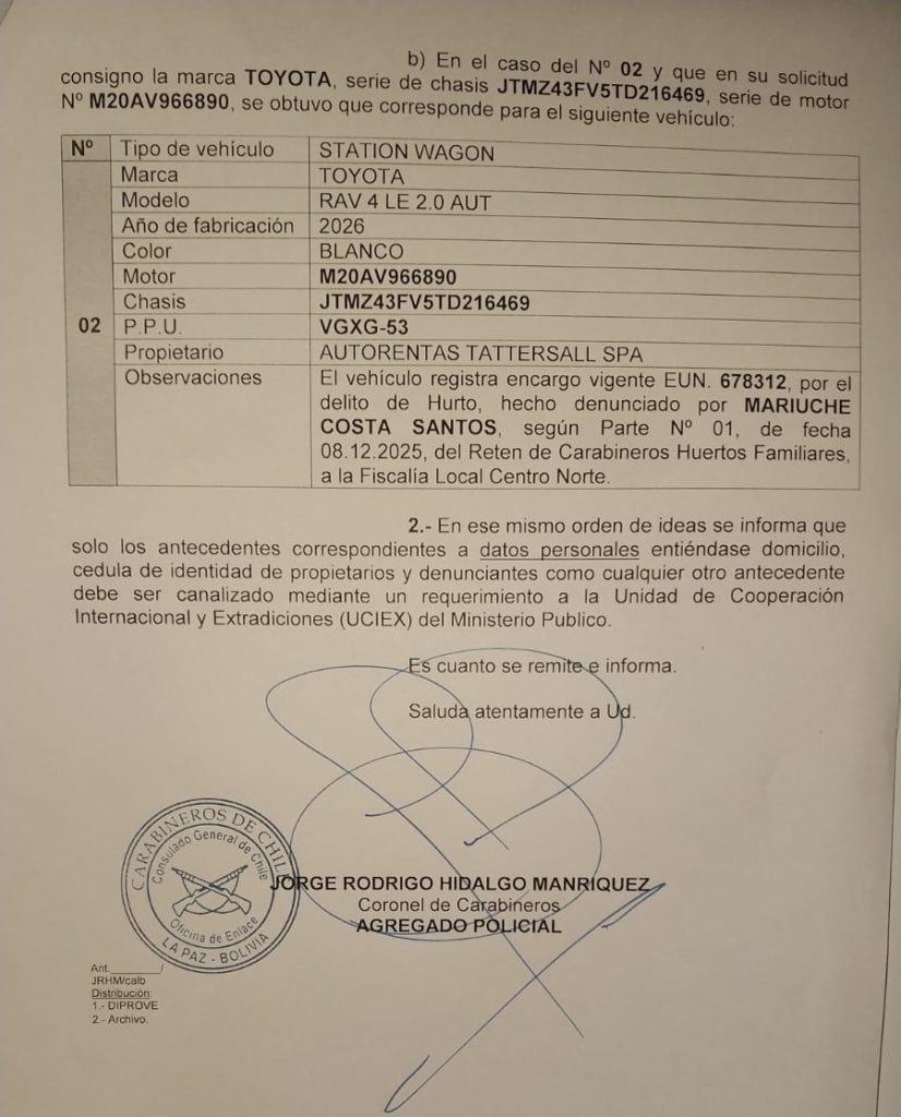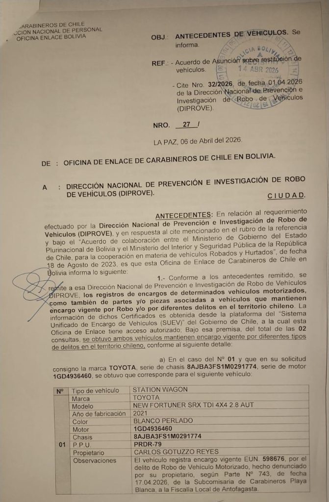 La historia comienza el 12 y 13 de marzo pasado, cuando la Dirección de Prevención de Robo de Vehículos (Diprove) de la Policía de Tupiza secuestra dos vagonetas Toyota que circulaban con placas clonadas de otros motorizados que están en otras regiones del país, aclara el comandante departamental de la Policía, Mirko Bustos Panique.