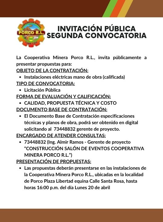 InicioRadio CambalacheInvitación Pública -... Invitación Pública – Segunda Convocatoria Por Equipo de Edición 17 abril, 2026 - 11:31 FacebookWhatsAppX Últimas Noticias Horóscopos de Mhoni Vidente para el fin de semana... Portada Chile y Bolivia iniciaron operativo conjunto contra las actividades delictivas en la frontera Portada Padres de Familia instalarán piquete de huelga esperando informe del Desayuno Escolar Portada Joaquino quiere implementar un modelo económico revolucionario Portada Alcaldesa anuncia visita a La Palca para comprobar daños y robos Continua leyendo Radio CambalacheInvitación Pública – Segunda Convocatoria Radio CambalacheRequerimiento de personal: Muestrero. Radio CambalacheInvitación – Gran Kermés Solidaria, Pastoral Social Caritas Potosí