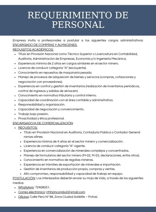 InicioRadio CambalacheRequerimiento de personal:... Requerimiento de personal: Encargado de compras y almacenes, Encargado/a de comercialización Por Equipo de Edición 17 abril, 2026 - 10:59 FacebookWhatsAppX Últimas Noticias Chile y Bolivia iniciaron operativo conjunto contra las actividades... Portada Padres de Familia instalarán piquete de huelga esperando informe del Desayuno Escolar Portada Joaquino quiere implementar un modelo económico revolucionario Portada Alcaldesa anuncia visita a La Palca para comprobar daños y robos Portada Investigan a presunta banda criminal que opera en el sur de Potosí Continua leyendo Radio CambalacheRequerimiento de personal: Muestrero. Radio CambalacheInvitación – Gran Kermés Solidaria, Pastoral Social Caritas Potosí Radio CambalacheRequerimiento de personal: Electricista.