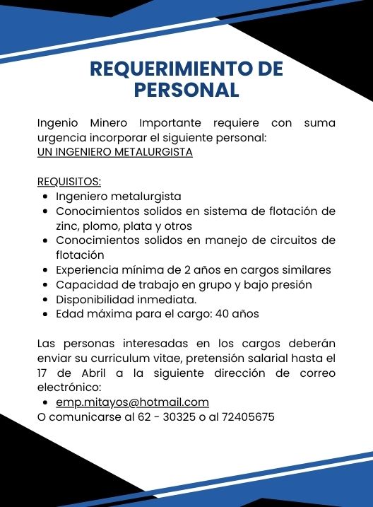 InicioRadio CambalacheRequerimiento de personal:... Requerimiento de personal: Ingeniero Metalurgista Por Equipo de Edición 17 abril, 2026 - 10:58 FacebookWhatsAppX Últimas Noticias Chile y Bolivia iniciaron operativo conjunto contra las actividades... Portada Padres de Familia instalarán piquete de huelga esperando informe del Desayuno Escolar Portada Joaquino quiere implementar un modelo económico revolucionario Portada Alcaldesa anuncia visita a La Palca para comprobar daños y robos Portada Investigan a presunta banda criminal que opera en el sur de Potosí Continua leyendo Radio CambalacheRequerimiento de personal: Muestrero. Radio CambalacheInvitación – Gran Kermés Solidaria, Pastoral Social Caritas Potosí Radio CambalacheRequerimiento de personal: Electricista.