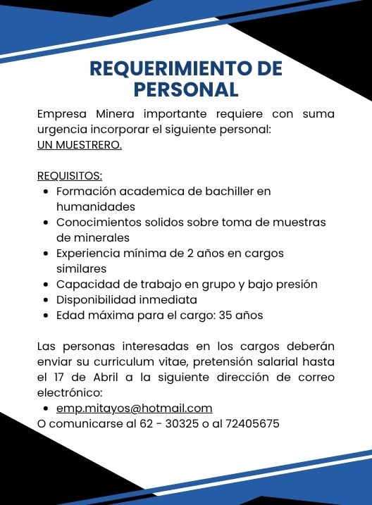 InicioRadio CambalacheRequerimiento de personal:... Requerimiento de personal: Muestrero. Por Equipo de Edición 17 abril, 2026 - 11:00 FacebookWhatsAppX Últimas Noticias Horóscopos de Mhoni Vidente para el fin de semana... Portada Chile y Bolivia iniciaron operativo conjunto contra las actividades delictivas en la frontera Portada Padres de Familia instalarán piquete de huelga esperando informe del Desayuno Escolar Portada Joaquino quiere implementar un modelo económico revolucionario Portada Alcaldesa anuncia visita a La Palca para comprobar daños y robos Continua leyendo Radio CambalacheInvitación – Gran Kermés Solidaria, Pastoral Social Caritas Potosí Radio CambalacheRequerimiento de personal: Electricista. Radio CambalacheRequerimiento de personal: Encargado de compras y almacenes, Encargado/a de comercialización