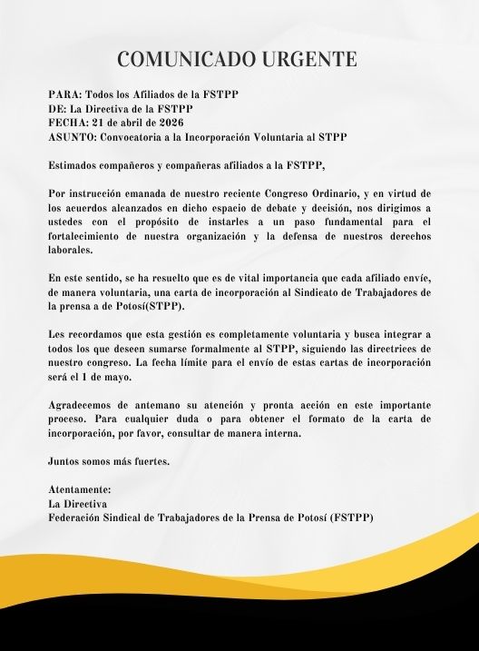 InicioRadio CambalacheComunicado Urgente -... Comunicado Urgente – Afiliados de la FSTPP Por Equipo de Edición 21 abril, 2026 - 16:17 FacebookWhatsAppX Últimas Noticias La biopic de Michael Jackson apuesta por el show... ¿Sabía usted? Qué tono de voz es el mejor para fortalecer la comunicación con perros y gatos Portada Camión sin frenos provoca aparatoso accidente y pone en riesgo a estudiantes en Cantumarca Nacional “Mario Cossío será asesor político”, señala María René Soruco, gobernadora electa de Tarija Nacional “Dejen vivir mi cárcel en paz”: Laura Rojas difunde carta desde su encierro en Palmasola Continua leyendo Radio CambalacheY ponga mucha atención a este aviso, nos vamos con el sector de Psicología Radio CambalacheSalutación – Unidad Educativa Modesto Omiste “A” Radio CambalacheSalutación – Sindicato de Trabajadores en Aguas AAPOS Potosí