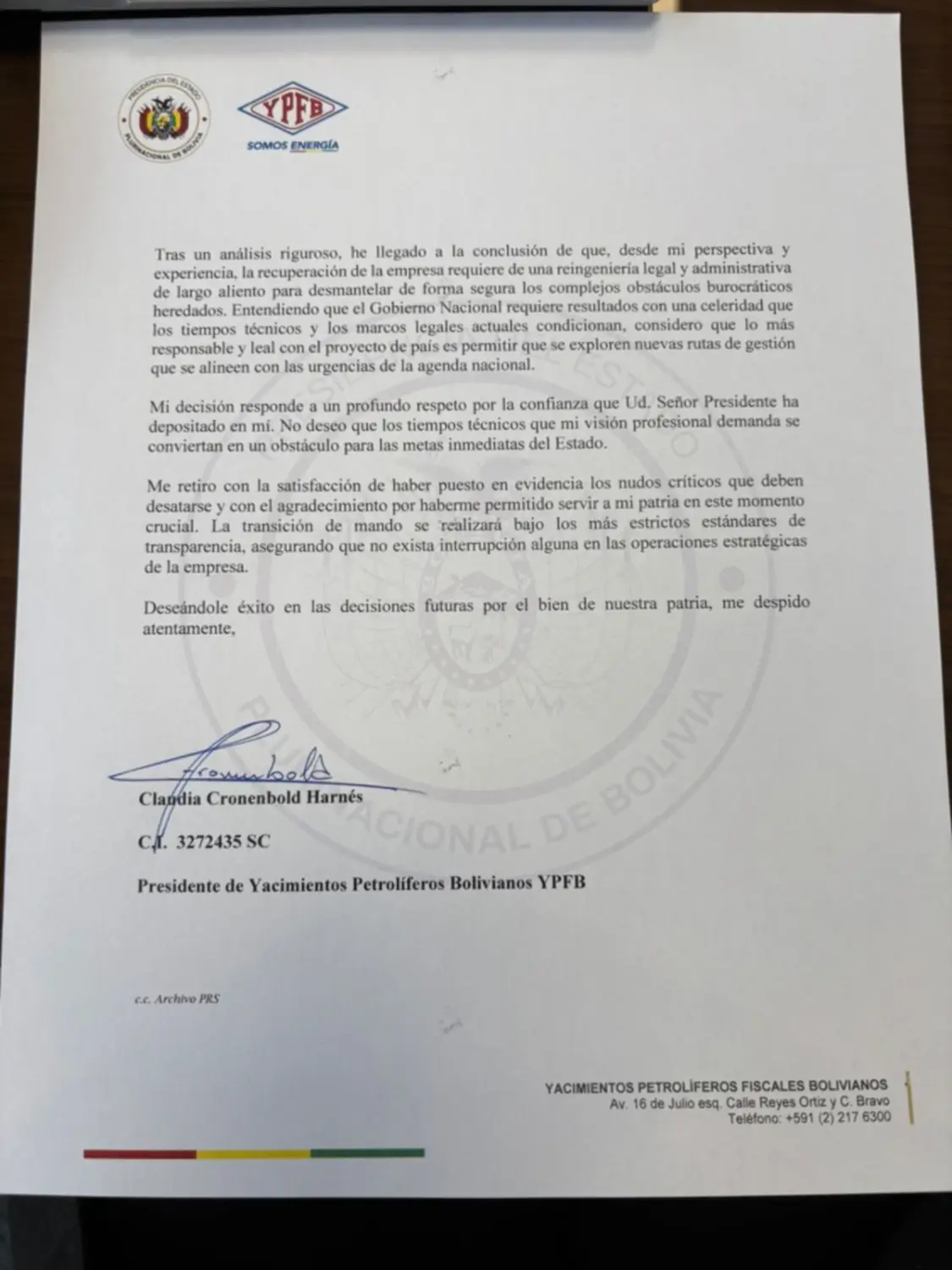 La dimisión fue formalizada mediante una carta dirigida al presidente Rodrigo Paz, en la que la ahora exautoridad señala que la recuperación de la estatal petrolera requiere una reingeniería legal y administrativa de largo aliento.