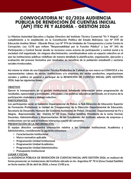InicioRadio CambalacheConvocatoria N° 02/2026 Convocatoria N° 02/2026 Por Equipo de Edición 23 abril, 2026 - 11:29 FacebookWhatsAppX Últimas Noticias Robo de equipos en el sistema La Palca rebasa... Nacional ¿Quién es Marcelo Blanco Quintanilla, el nuevo ministro de Hidrocarburos? Nacional Rodrigo Paz posesiona a Marcelo Blanco Quintanilla como nuevo ministro de Hidrocarburos Portada Abogada señala que jóvenes del caso “Jucus” fueron captados con ofertas económicas elevadas para trabajar en minas Portada Anuncian feria educativa y premiación de concurso infantil por el Día del Niño en Potosí Continua leyendo Radio CambalacheSalutación – Club del Libro “Gesta Bárbara 1918” Radio CambalacheLa novedad del sabor, ahora en Potosí…!!! Gran apertura de Pasteleria “Dulce de Leche” Radio CambalacheInvitación Pública – Segunda Convocatoria