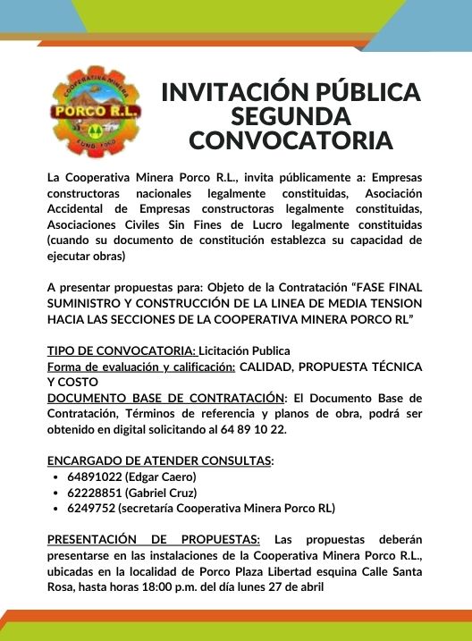 InicioRadio CambalacheInvitación Pública -... Invitación Pública – Segunda Convocatoria Por Equipo de Edición 23 abril, 2026 - 11:28 FacebookWhatsAppX Últimas Noticias Robo de equipos en el sistema La Palca rebasa... Nacional ¿Quién es Marcelo Blanco Quintanilla, el nuevo ministro de Hidrocarburos? Nacional Rodrigo Paz posesiona a Marcelo Blanco Quintanilla como nuevo ministro de Hidrocarburos Portada Abogada señala que jóvenes del caso “Jucus” fueron captados con ofertas económicas elevadas para trabajar en minas Portada Anuncian feria educativa y premiación de concurso infantil por el Día del Niño en Potosí Continua leyendo Radio CambalacheSalutación – Club del Libro “Gesta Bárbara 1918” Radio CambalacheLa novedad del sabor, ahora en Potosí…!!! Gran apertura de Pasteleria “Dulce de Leche” Radio CambalacheConvocatoria N° 02/2026