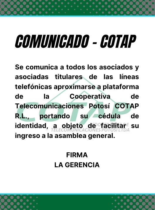 InicioRadio CambalacheComunicado - COTAP Comunicado – COTAP Por Equipo de Edición 24 abril, 2026 - 11:37 FacebookWhatsAppX Últimas Noticias FSTP de Potosí confirma congreso para este fin de... Portada Fencomin rompe diálogo gobierno y advierte con paro Portada Gracias ASBORA, Gracias Potosí por seguir al servicio del pueblo Portada Radio Kollasuyo recibió el “Micrófono de Oro” por 59 años de servicio a su pueblo Portada Porcel denuncia hecho de corrupción referido a bolsas de cemento Continua leyendo Radio Cambalache¿Te gustaria aprender agroecología y producir tus propios alimentos? Radio CambalacheConsultorio Médico Naturista PARAISO Radio CambalacheSalutación – Club del Libro “Gesta Bárbara 1918”
