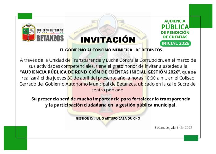 InicioRadio CambalacheINVITACIÓN A LA... INVITACIÓN A LA AUDIENCIA PUBLICA DE RENDICION DE CUENTAS INICIAL 2026 Por Equipo de Edición 27 abril, 2026 - 14:00 FacebookWhatsAppX Últimas Noticias Tras denuncias de “monopolio”, YPFB y Cámara de Transporte... Horóscopo Horóscopos de Mhoni Vidente: predicciones del 27 al 30 de abril para cada signo Portada Hombre fallece tras ser auxiliado en la Feria Popular de la zona Ferroviaria Deportes Oriente se aplica en el complemento y se impone a Real Potosí Portada Empleada doméstica esperaba cobrar su sueldo pero fue vejada por su empleador Continua leyendo Radio CambalacheCOMUNICADO PAGO DE IMPUESTOS MUNICIPALES CON DESCUENTOS Radio Cambalache¡¡¡El Museo Santa Teresa de Potosí cumple 50 años!!! Radio CambalacheSalutación – Feria Mariscal Santa Cruz